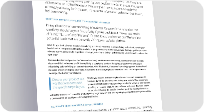 The Power of Unity For more information, please visit integrate.com/contact © 2019 Integrate Inc. B2B Display Advertising: Find, Nurture, and Harvest. CREATIVITY MAY BE ELUSIVE, BUT IT’S ABSOLUTELY NECESSARY In any situation where marketing is involved, it’s essential to remember that creativity should be your first priority. Cycling back to our three phase model of “Find’, “Nurture” and “Harvest”, it’s time to explore how we can “Nurture” the potential leads that are currently visiting your website platform. What do you think of when it comes to nurturing your leads? According to one marketing professional, nurturing can be defined as “the process of building a relationship by conducting an informative dialog that helps qualified prospects who are not yet sales-ready, regardless of budget, authority, or timing – and of ensuring a clean handoff to sales at the right time.” Can an advertisement provide the “informative dialog” mentioned here? Marketing experts at Forrester Research discovered that web users are 56% more likely to complete a purchase if they first encounter engaging display advertising before clicking on a search-based ad. With this in mind, it becomes increasingly apparent that the RIGHT message shown on display advertising may lead to dramatically improved conversion rates. The more personal the message, the better your chances! What if you decided to create display ads which mirrored your prospect’s behavior during the time they were visiting your website? Say, for example, you noticed that client ‘A’ was spending a substantial amount of time browsing your blog or resource page. An ebook offer or whitepaper download may be an excellent offering! If a specific client has spent the majority of their time within their online cart or on the product pricing page found on your site, repackaging competitive pricing offers within a personalized ad could prove to be highly effective! SO, WHAT’S NEXT? HARVEST, HARVEST, HARVEST It’s absolutely critical that business owners transform casual interest into rewarding sales conversions. This processing of “harvesting” involves any tactics and strategies that lead B2B buyers back into the sales funnel to close on a deal. Knowing full well that ad personalization produces outstanding user engagement, here are a few ways in which you could tailor your advertisements to prospective buyers: Discuss your product in a way that resonates with the specific target buyers. tailored online experience but are wary of turning them away with too many form fields. Essentially, progressive profiling uses cookies in order to ensure that repeat visitors who do utilize the onsite form are given new questions on each visit, ultimately allowing for increased, incremental information collection that doesn’t feel overbearing.