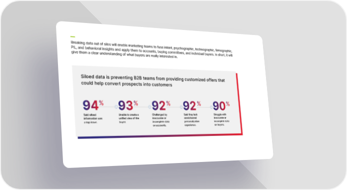Breaking data out of silos will enable marketing teams to fuse intent, psychographic, technographic, firmographic, PIL, and behavioral insights and apply them to accounts, buying committees, and individual buyers. In short, it will give them a clear understanding of what buyers are really interested in. Siloed data is preventing B2B teams from providing customized offers that could help convert prospects into customers 94% 93% 92% 92% 90% Said siloed Unable to create a Challenged by Said they lack Struggle with information was unified view of the inaccurate or omnichannel inaccurate or a top issue. buyer. incomplete data personalization incomplete data on accounts. experience. on buyers.