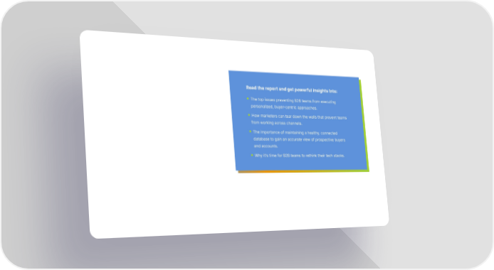 For B2B marketers, the days of intrusive sales calls, irrelevant display ads, spammy LinkedIn requests, and broad-brush marketing are over. Today’s buyers expect personalization at every stage of their journey, across every channel. The stakes are high, as the Read the report and get powerful insights into: digital age has placed buyers firmly in the driver’s seat. To break through crowded channels and convert prospects into buyers, B2B The top issues preventing B2B teams from executing teams must deliver next-level personalization that speaks directly personalized, buyer-centric approaches. to a buyer’s pain points, needs, and business goals. How marketers can tear down the walls that prevent teams But new research shows many organizations are still stuck in the past and have yet to adjust their marketing tactics to deliver the from working across channels. personal touch that today’s buyers crave. According to the survey, only 20 percent of marketers personalize their strategies and tactics The importance of maintaining a healthy, connected for buyers. It should come as no surprise then that only 12 percent database to gain an accurate view of prospective buyers said their teams are hitting their marketing goals with their current and accounts. personalization strategies. Why it’s time for B2B teams to rethink their tech stacks. This report examines where marketers are falling short on their personalization efforts and explores the emergence of Precision Demand Marketing (PDM), a new approach that delivers buyers the relevant information they need, right where and when they need it.