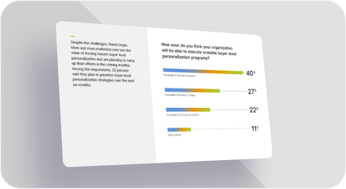 Despite the challenges, there’s hope. How soon do you think your organization More and more marketers now see the will be able to execute scalable buyer-level value of moving toward buyer-level personalization programs? personalization and are planning to ramp up their efforts in the coming months. 40% Among the respondents, 22 percent said they plan to prioritize buyer-level Prioritized for the next 12 months personalization strategies over the next six months. 27% Prioritized in the next 2-5 years 22% Prioritized for the next six months % 11 Not a priority