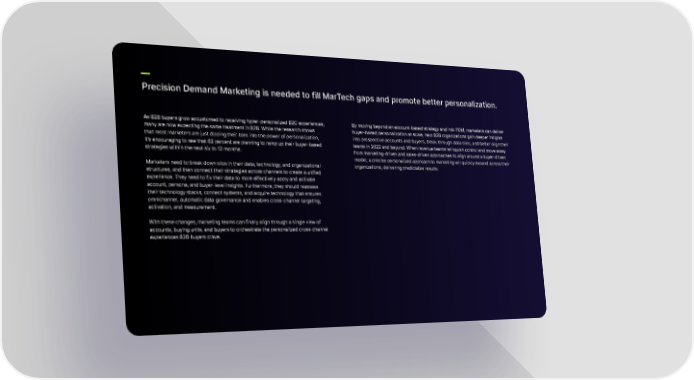 Precision Demand Marketing is needed to fill MarTech gaps and promote better personalization. As B2B buyers grow accustomed to receiving hyper-personalized B2C experiences, By moving beyond an account-based strategy and into PDM, marketers can deliver many are now expecting the same treatment in B2B. While the research shows buyer-based personalization at scale, help B2B organizations gain deeper insights that most marketers are just dipping their toes into the power of personalization, into prospective accounts and buyers, break through data silos, and better align their it’s encouraging to see that 62 percent are planning to ramp up their buyer-based teams in 2022 and beyond. When revenue teams relinquish control and move away strategies within the next six to 12 months. from marketing-driven and sales-driven approaches to align around a buyer-driven model, a precise personalized approach to marketing will quickly expand across their Marketers need to break down silos in their data, technology, and organizational organizations, delivering predictable results. structures, and then connect their strategies across channels to create a unified experience. They need to fix their data to more effectively apply and activate account, persona, and buyer-level insights. Furthermore, they should reassess their technology stacks, connect systems, and acquire technology that ensures omnichannel, automatic data governance and enables cross-channel targeting, activation, and measurement. With these changes, marketing teams can finally align through a single view of accounts, buying units, and buyers to orchestrate the personalized cross-channel experiences B2B buyers crave.