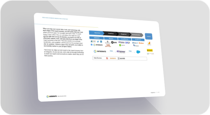 P — 21 Integrate.com Where Business Starts PRECISION DEMAND MARKETING STRATEGY When you map your current data, tools, and technology with each stage of the buyer’s journey, you will quickly discover if and where you have gaps. For example, let’s look at data. To meet today’s buyer where they are and deliver the right message and the right time across all channels, you need to be able to effectively capture, track, and pass data from one stage of the buyer’s journey to the next. That data needs to be accurate, marketable, and compliant, and the process for passing it must also be scalable. If there’s a gap at any one point, your ability to successfully market to your prospect falters. Here’s how we align our tech stack to the buyer’s journey here at Integrate. As you can see, we’re able to leverage technology to meet our buyers and accounts no matter where they are on their journey.