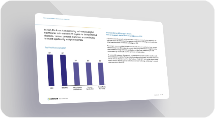 P — 15 Integrate.com In 2021, the focus is on delivering self-service digital experiences to in-market B2B buyers via their preferred channels. To meet demand, marketers are continuing to invest significantly in digital channels. Top Five Channels In 2021 Where Business Starts Precision Demand Strategy in Action: How to Engage In Market Account and Buyers in 2021 A Precision Demand approach enables marketers to engage accounts, buying committees, and individual buyers via all the tools in their arsenal: account-based marketing, content syndication, virtual events/webinars, social media marketing, and PPC. For example, you can combine ABM with content syndication and social media, target accounts with awareness-level ABM display ads, connect with buying committees at engaged accounts with consideration stage content via syndication, and then target individual buyers with conversion-stage social media ads. The options are virtually endless. To successfully implement this approach, you need clean, accurate, compliant data from each demand channel in real time. That provides the intelligence for the next step, which would focus activity on every channel around the Ideal Customer Profile (ICP). With the right data coming in from all demand channels, you can orchestrate channels, technology, and strategy to connect with buyers more effectively. ABM SEM/PPC Virtual Events and Webinars Content Syndication Social Media Marketing 85 % 85 % 83 % 83 % 83 % PRECISION DEMAND MARKETING STRATEGY