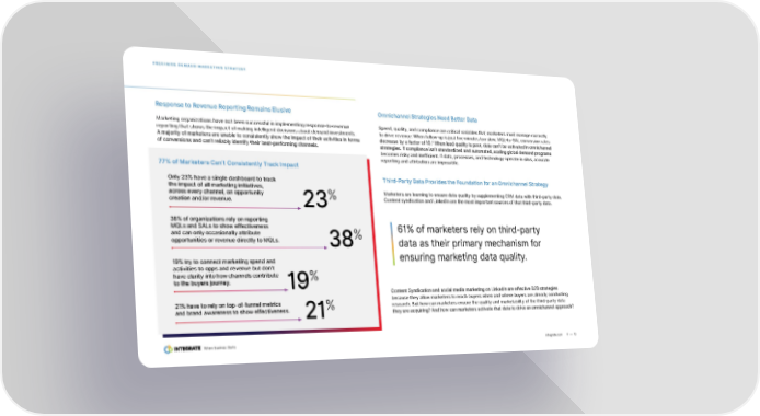 Omnichannel Strategies Need Better Data Speed, quality, and compliance are critical variables that marketers must manage correctly to drive revenue. When follow-up is just five minutes too slow, MQL-to-SAL conversion rates decrease by a factor of 10. 3 When lead quality is poor, data can’t be activated in omnichannel strategies. If compliance isn’t standardized and automated, scaling global demand programs becomes risky and inefficient. If data, processes, and technology operate in silos, accurate reporting and attribution are impossible. Third-Party Data Provides the Foundation for an Omnichannel Strategy Marketers are learning to ensure data quality by supplementing CRM data with third-party data. Content syndication and LinkedIn are the most important sources of that third-party data. Response to Revenue Reporting Remains Elusive Marketing organizations have not been successful in implementing response-to-revenue reporting that shows the impact of making intelligent decisions about demand investments. A majority of marketers are unable to consistently show the impact of their activities in terms of conversions and can’t reliably identify their best-performing channels. P — 13 Integrate.com Where Business Starts PRECISION DEMAND MARKETING STRATEGY Content Syndication and social media marketing on LinkedIn are effective B2B strategies because they allow marketers to reach buyers when and where buyers are already conducting research. But how can marketers ensure the quality and marketability of the third-party data they are acquiring? And how can marketers activate that data to drive an omnichannel approach? 61% of marketers rely on third-party data as their primary mechanism for ensuring marketing data quality. 77% of Marketers Can’t Consistently Track Impact 21% have to rely on top-of-funnel metrics and brand awareness to show effectiveness. 21 % 23 % Only 23% have a single dashboard to track the impact of all marketing initiatives, across every channel, on opportunity creation and/or revenue. 19 % 19% try to connect marketing spend and activities to opps and revenue but don’t have clarity into how channels contribute to the buyers journey. 38 % 38% of organizations rely on reporting MQLs and SALs to show effectiveness and can only occasionally attribute opportunities or revenue directly to MQLs.