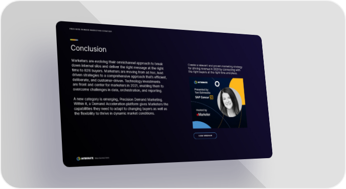 Conclusion Marketers are evolving their omnichannel approach to break down internal silos and deliver the right message at the right time to B2B buyers. Marketers are moving from ad hoc, lead driven strategies to a comprehensive approach that’s efficient, deliberate, and customer-driven. Technology investments are front and center for marketers in 2021, enabling them to overcome challenges in data, orchestration, and reporting. A new category is emerging, Precision Demand Marketing. Within it, a Demand Acceleration platform gives Marketers the capabilities they need to adapt to changing buyers as well as the flexibility to thrive in dynamic market conditions. Create a relevant and proven marketing strategy for driving revenue in 2021 by connecting with the right buyers at the right time and place. PRECISION DEMAND MARKETING STRATEGY Where Business Starts VIEW WEBINAR