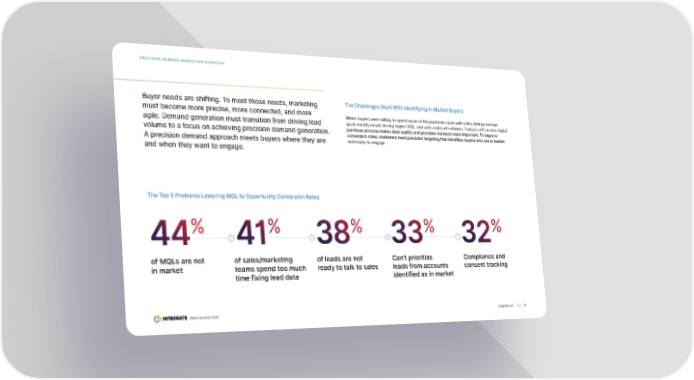 P — 10 Integrate.com Buyer needs are shifting. To meet those needs, marketing must become more precise, more connected, and more agile. Demand generation must transition from driving lead volume to a focus on achieving precision demand generation. A precision demand approach meets buyers where they are and when they want to engage. The Challenges Start With Identifying In Market Buyers When buyers were willing to spend more of the purchase cycle with sales, hitting revenue goals mostly meant driving higher MQL and sales outreach volumes. Today’s self-service digital purchase process makes data quality and precision outreach more important. To improve conversion rates, marketers need precision targeting that identifies buyers who are in market and ready to engage. The Top 5 Problems Lowering MQL to Opportunity Conversion Rates Where Business Starts PRECISION DEMAND MARKETING STRATEGY of MQLs are not in market of leads are not ready to talk to sales Can’t prioritize leads from accounts identified as in market Compliance and consent tracking of sales/marketing teams spend too much time fixing lead data 44 % 41 % 38 % 33 % 32 %