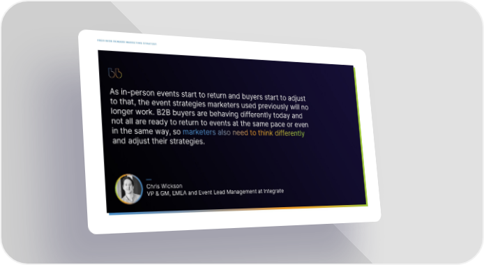 PRECISION DEMAND MARKETING STRATEGY As in-person events start to return and buyers start to adjust to that, the event strategies marketers used previously will no longer work. B2B buyers are behaving differently today and not all are ready to return to events at the same pace or even in the same way, so marketers also need to think differently and adjust their strategies. — Chris Wickson VP & GM, EMEA and Event Lead Management at Integrate