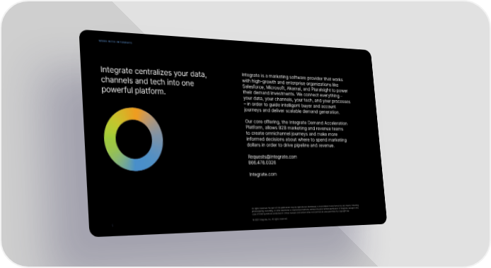 WORK WITH INTEGRATE Integrate centralizes your data, Integrate is a marketing software provider that works with high-growth and enterprise organizations like channels and tech into one Salesforce, Microsoft, Akamai, and Pluralsight to power powerful platform. their demand investments. We connect everything – your data, your channels, your tech, and your processes – in order to guide intelligent buyer and account journeys and deliver scalable demand generation. Our core offering, the Integrate Demand Acceleration Platform, allows B2B marketing and revenue teams to create omnichannel journeys and make more informed decisions about where to spend marketing dollars in order to drive pipeline and revenue. [email protected] 866.478.0326 Integrate.com All rights reserved. No part of this publication may be reproduced, distributed, or transmitted in any form or by any means, including photocopying, recording, or other electronic or mechanical methods, without the prior written permission of Integrate, except in the case of brief quotations embodied in critical reviews and certain other noncommercial uses permitted by copyright law. © 2021 Integrate, Inc. All rights reserved.