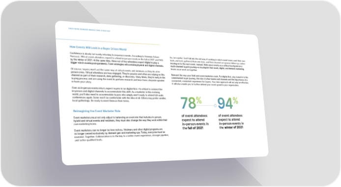 PRECISION DEMAND MARKETING STRATEGY How Events Will Look in a Buyer Driven World Confidence is slowly but surely returning to in-person events. According to Freeman Future So, be careful. Don’t fall into the old way of working in which event teams used their o wn Forecast, 78% of event attendees expect to attend in-person events in the fall of 2021 and 94% tools and tech, gathered their own data, and then churned out generic follow-ups before by the winter of 2021. At the same time, three out of four attendees expect digital to play a moving on to the next event. Instead, think about events as a critical touchpoint on a bigger role in events post-pandemic. Event strategies will combine physical and digital channels. multi-channel buyer’s journey—a touchpoint that event, digital, and demand mark eting teams must work on together. Of course, buyers won’t act the same way at virtual events and webinars as they do at in- Reinvent the way your field and event marketers work. Put digital first, stay tuned-in to the person ones. Virtual attendees are less engaged. They’re passive and often are relying on this omnichannel buyer journey, the role of other teams and channels and the importance of a channel as part of their research, data gathering, or discovery. Many times, they’re early in the buying process and are using the event to perform research and hear from a keynote speaker connected, consistent experience for buyers. Your new approach will not only be eff ective, or learn your story. it will also enable you to further defend your event spend to your organization. Even as in-person events return, expect buyers to be digital-first. It’s critical to connect the in-person and digital channels to accommodate this shift. As a marketer in this evolving world, you’ll also need to accommodate buyers who simply aren’t ready to attend full-scale conferences again. Some won’t be comfortable with the idea at all. Others may prefer smaller, local gatherings. Be ready to meet them on their terms. 78% 94% Reimagining the Event Marketer Role Event marketers must not only adjust to balancing an event mix that includes in-person, of event attendees of event attendees hybrid and virtual events and webinars, they must also change the way they work within their expect to attend expect to attend own marketing teams. in-person events in in-person events in Event marketers can no longer be lone wolves. Webinars and other digital programs are the fall of 2021 the winter of 2021 no longer owned exclusively by demand gen and marketing ops. Today, everyone must be invested. Together. Collaboration is to the key to a better event experience, stronger pipeline, and better qualified leads.