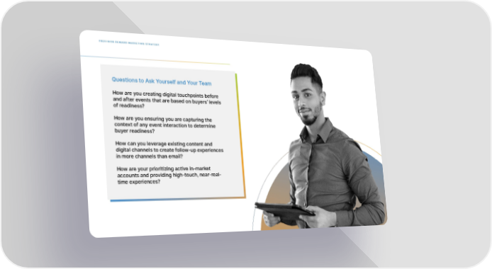 PRECISION DEMAND MARKETING STRATEGY Questions to Ask Yourself and Your Team How are you creating digital touchpoints before and after events that are based on buyers’ levels of readiness? How are you ensuring you are capturing the context of any event interaction to determine buyer readiness? How can you leverage existing content and digital channels to create follow-up experiences in more channels than email? How are your prioritizing active in-market accounts and providing high-touch, near-real- time experiences?