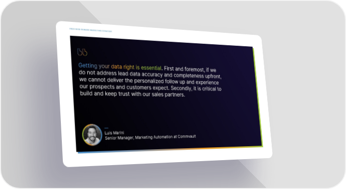 PRECISION DEMAND MARKETING STRATEGY Getting your data right is essential. First and foremost, if we do not address lead data accuracy and completeness upfront, we cannot deliver the personalized follow up and experience our prospects and customers expect. Secondly, it is critical to build and keep trust with our sales partners. — Luis Marini Senior Manager, Marketing Automation at Commvault