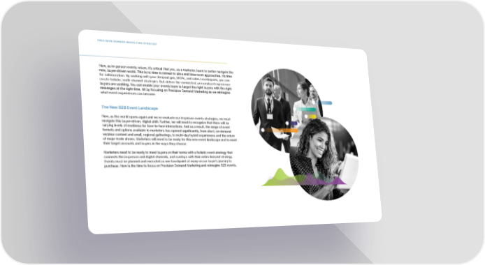 PRECISION DEMAND MARKETING STRATEGY Now, as in-person events return, it’s critical that you, as a marketer, learn to better navigate the new, buyer-driven world. This is no time to retreat to silos and time-worn approaches. It’s time for collaboration. By working with your demand gen, MOPs, and sales counterparts, you can create holistic, multi-channel strategies that deliver the connected, personalized experience buyers are seeking. You can enable your events team to target the right buyers with the right messages at the right time. All by focusing on Precision Demand Marketing as we reimagine what event experiences can become. The New B2B Event Landscape Now, as the world opens again and we re-evaluate our in-person events strategies, we must navigate this buyer-driven, digital shift. Further, we will need to recognize that there will be varying levels of readiness for face-to-face interactions. And as a result, the range of event formats and options available to marketers has opened significantly, from short, on-demand webinar content and small, regional gatherings, to multi-day hybrid experiences and the return of major trade shows. Marketers will need to be ready for this new event landscape and to meet their target accounts and buyers in the ways they choose. Marketers need to be ready to meet buyers on their terms with a holistic event strategy that connects the in-person and digital channels, and overlays with their entire demand strategy. Events must be planned and executed as one touchpoint of many on our buyer’s journey to purchase. Now is the time to focus on Precision Demand Marketing and reimagine B2B events.