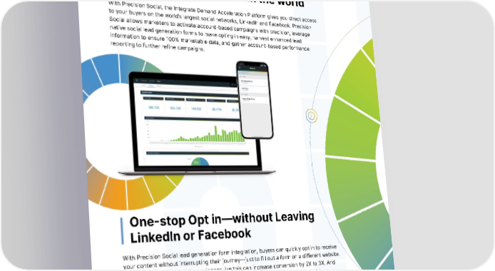 Where Business Starts For more information, please visit integrate.com/contact © 2022 Integrate Inc. PRECISION SOCIAL Connect with your buyers in the most trusted social networks in the world With Precision Social, the Integrate Demand Acceleration Platform gives you direct access to your buyers on the world’s largest social networks, LinkedIn and Facebook. Precision Social allows marketers to activate account-based campaigns with precision, leverage native social lead generation forms to make opting in easy, harvest enhanced lead information to ensure 100% marketable data, and gather account-based performance reporting to further refine campaigns. One-stop Opt in—without Leaving LinkedIn or Facebook With Precision Social lead generation form integration, buyers can quickly opt in to receive your content without interrupting their journey—just to fill out a form on a different website. Delivering cohesive social experiences like this can increase conversion by 2X to 3X. And with Integrate lead enhance capability, you’ll know your leads are 100% marketable.